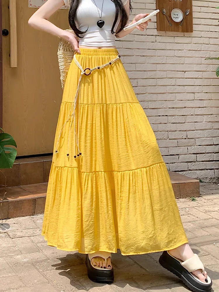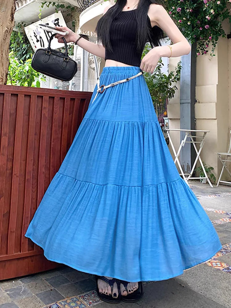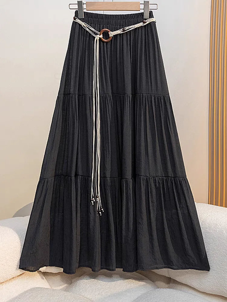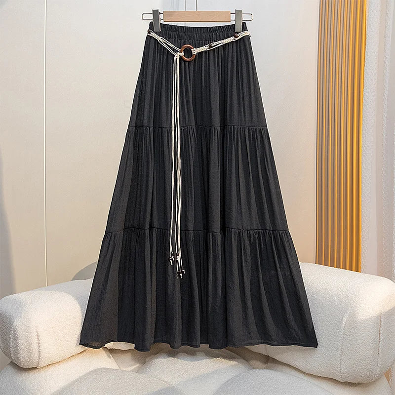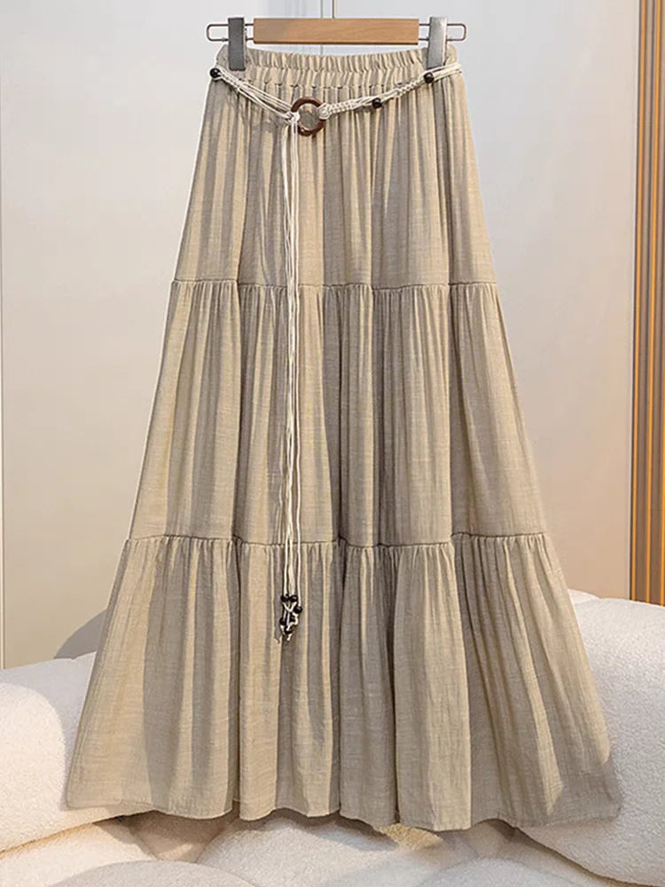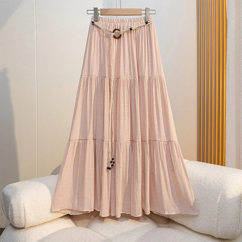 Boho Summer Cotton-Linen Midi Skirt: Flowy A-Line Pleated Long Skirt with Slimming Fit & Hip-Hiding Design for Resort Vacations