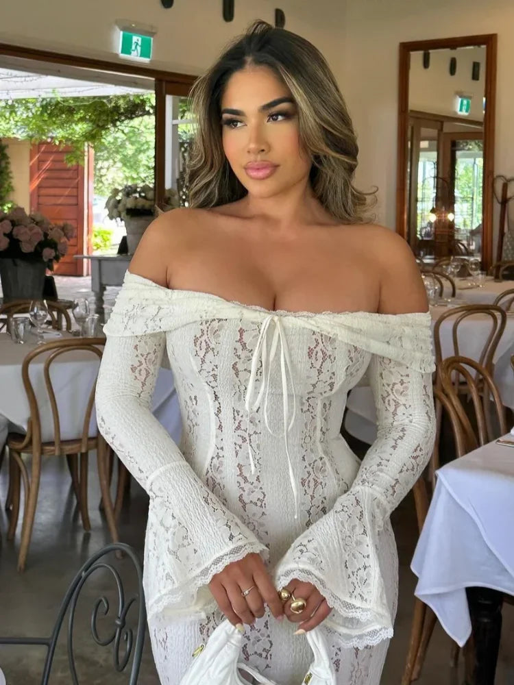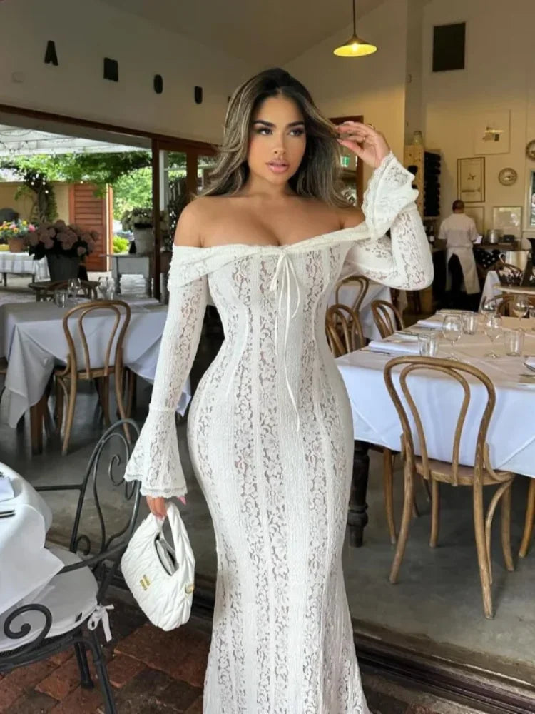 Model Number: Elegant Women White Lace Hollow Out Printed Flower Long Dress