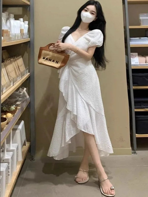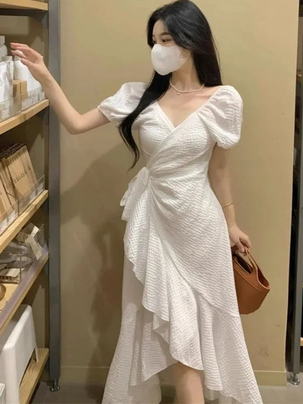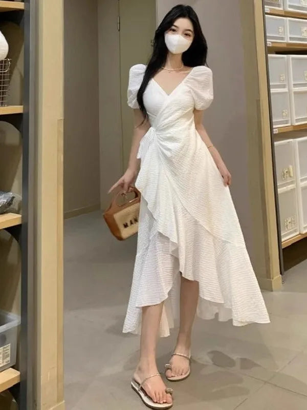 The dress's asymmetrical hemline and short sleeves add a modern twist to a classic A-line silhouette, ensuring you stand out in any crowd.