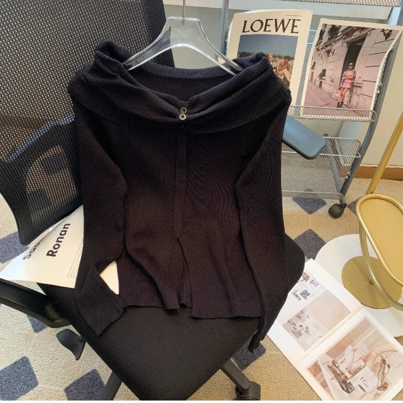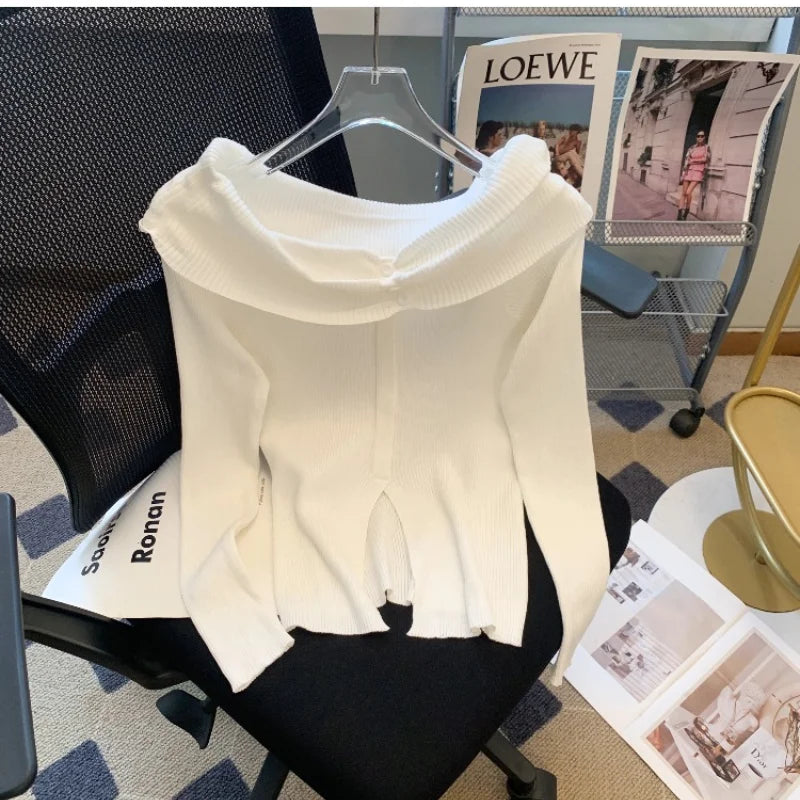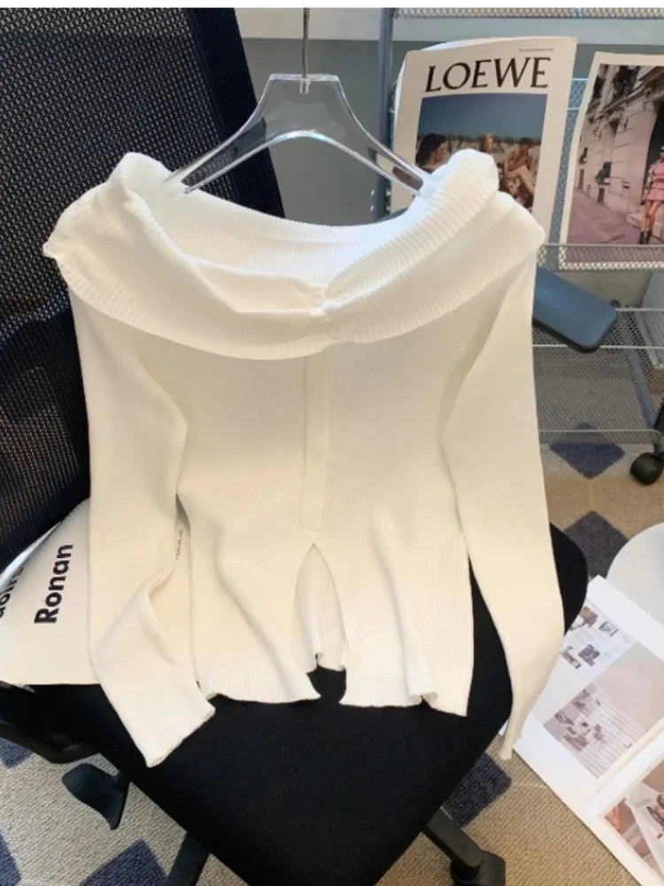 New Striped Off Shoulder Knitted Top Casual Ruched Long Sleeve Split Sweater For Spring & Fall, Women's Clothing