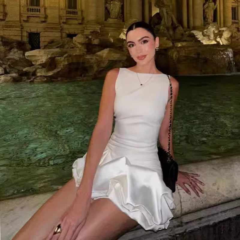 Sexy Women Red Ruffles Hem Mini Dress Elegant O Neck Backless Sleeveless Slim Vestidos Fashion Lady Evening Party Club Gowns